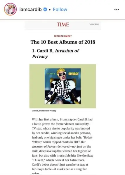 It’s safe to say Cardi B’s self-confidence and drive to succeed are what lead to her debut album, “Invasion of Privacy,” being crowned the #1 album of the year by Time Magazine. Cardi made the announcement on Instagram.