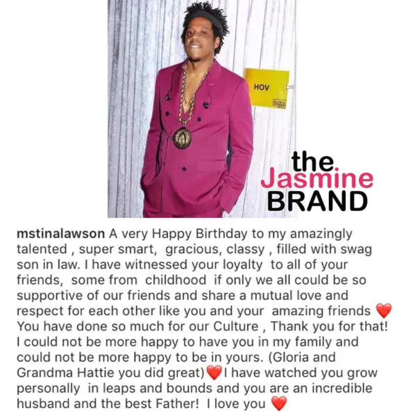 Many New York natives would consider December 4th a local holiday, due to it being the birth of Shawn “Jay-Z” Carter. While fans still await to see what his wife Beyoncé Knowles-Carter is going to say about her husband on his special day, his mother-in-law Tina Lawson has already sent a happy birthday message to the “Family Feud” rapper.