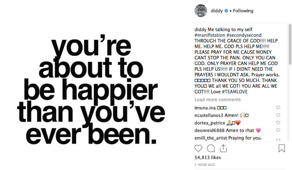 Sean ‘Diddy’ Combs is asking for prayers and strength during a difficult time in his life. Early Friday morning, Diddy posted a message asking God for help and asking for people to pray for him.