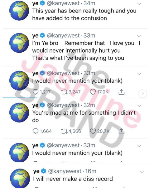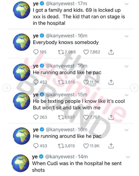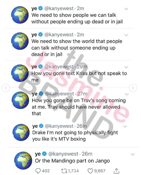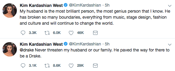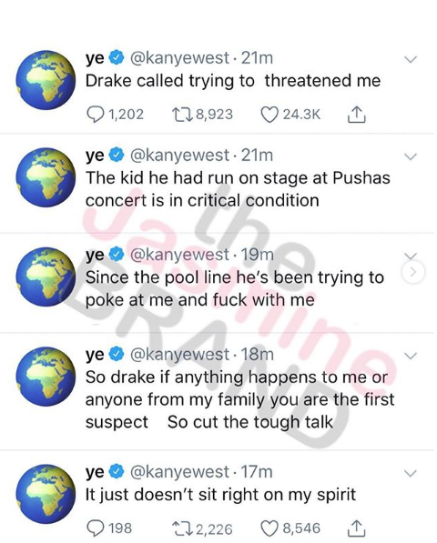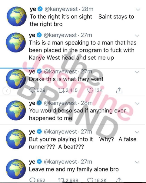 Kanye later hopped on Twitter, accusing Drake of trying to threaten his family. See the tweets below.