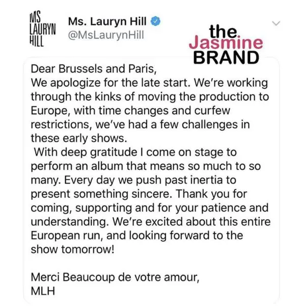 Unfortunately, she’s still apologizing for tardiness. In fact, she’s become notorious for it. Just last month, Lauryn issued an apology to Brussels and Paris fans for showing up late to her “Mis-Education 20th Anniversary Tour.”