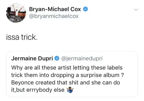 “Why are all these artist letting these labels trick them into dropping a surprise album ? Beyonce created that sh*t and she can do it,but errrybody else (shrug emoji)”