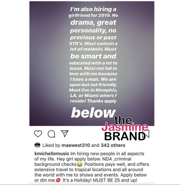 K.Michelle is looking to hire a girlfriend to share with her boyfriend. On Monday, the singer and Love & Hip Hop star posted a social media message stating the qualifications for her woman. According to the requirements, the perspective bae must be 25, educated, no STDs, willing to travel and sign an NDA. See the entire post below.