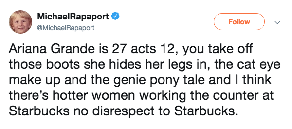 Ariana Grande is 27 acts 12, you take off those boots she hides her legs in, the cat eye make up and the genie pony tale and I think there’s hotter women working the counter at Starbucks no disrespect to Starbucks.