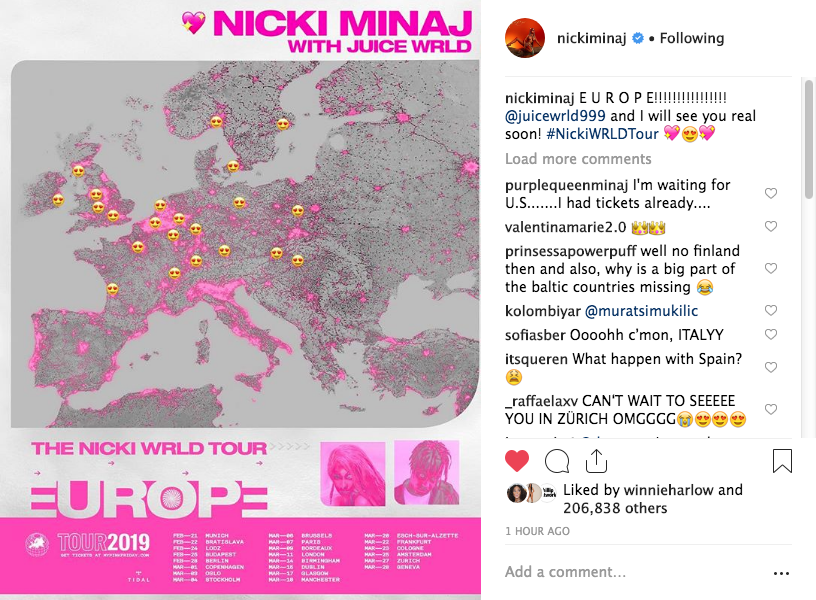 Nicki Minaj has announced her European Tour! She’s teamed up with Juice World, kicking off the tour in Munich, visiting Stockholm, Brussels, Paris, London, Manchester, Amsterdam and more places. See her announcement below.