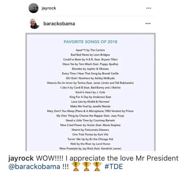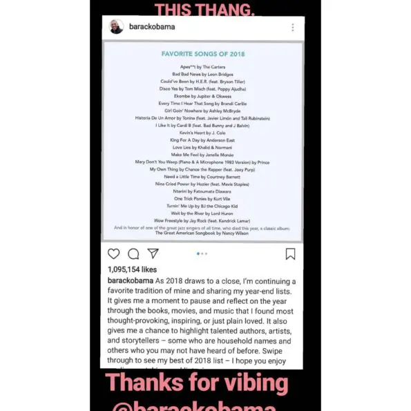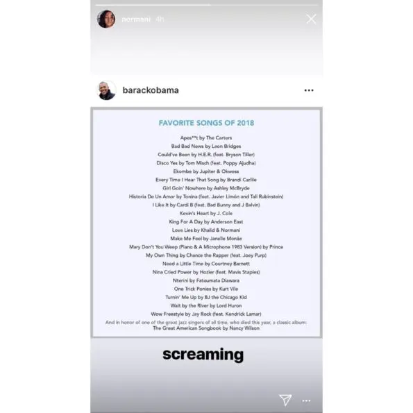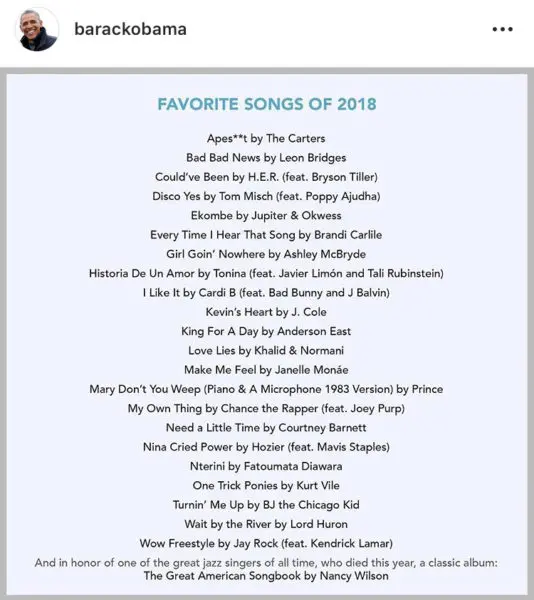 Former President Barack Obama shared his yearly music favorites on Instagram Friday (Dec. 28), two days ahead of the New Year. Some notable artists from 2018 landed on the list like H.E.R., The Carters, Jay Rock, J. Cole, Janelle Monae, and Normani with Khalid.