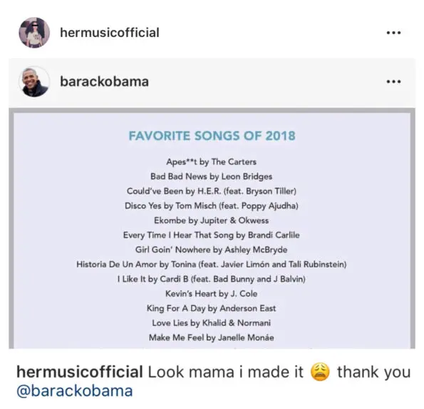 H.E.R. reacted to the news by reposting the list from Obama’s Instagram and captioning,