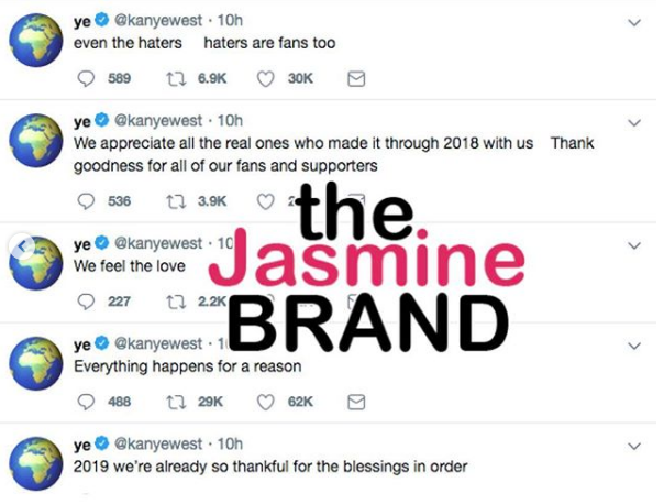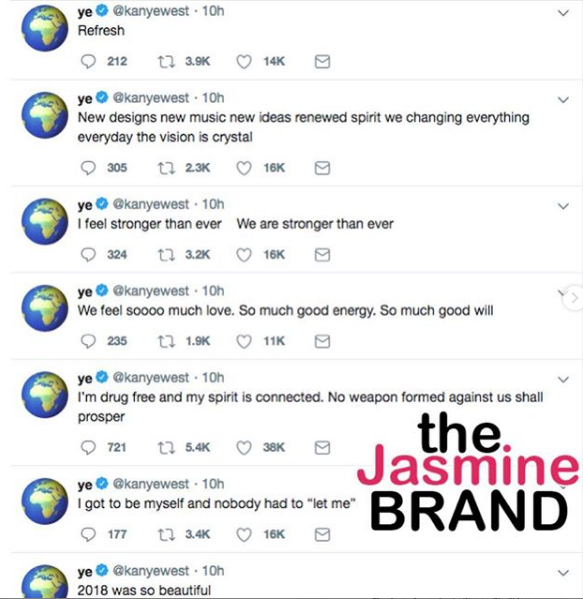 Kanye West is reflecting on 2018 and sharing his plans for 2019. In a series of tweets, the 41-year-old artist explained that he’s ‘drug free’ and his ‘spirit is connected’. He even references a bible scripture (Isaiah 54:17) in a tweet and shares that in 2019 he’ll be working on new designs, music and ideas. See his tweets below.