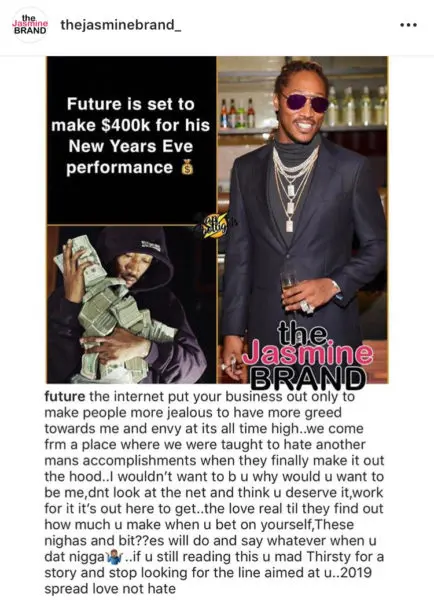 Future sent a final introspective message to his followers, haters, and whoever was in reach of receiving the sentiments to close out the year. On Monday (Dec. 31), the Atlanta rapper re-shared a photo of himself which had a caption attached to it, detailing the income he would be receiving for hosting a New Year’s Eve gig in Las Vegas.