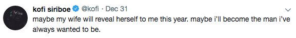 “@kofi maybe my wife will reveal herself to me this year. maybe i’ll become the man i’ve always wanted to be.”