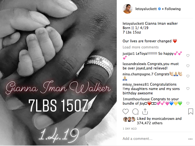 Congratulations to LeToya Luckett and husband Tommicus Walker. The pair welcomed their first child together, a baby girl named Gianna Iman Walker. Baby Gianna was born on January 4th. LeToya shared a glimpse of the couple holding their newborn’s hand sweetly captioning the image,