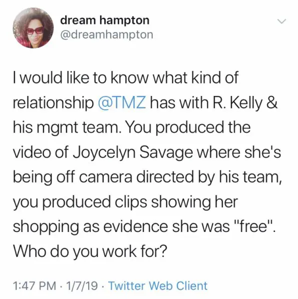 “I would like to know what kind of relationship @TMZ has with R. Kelly & his mgmt team. You produced the video of Joycelyn Savage where she’s being off camera directed by his team, you produced clips showing her shopping as evidence she was “free”. Who do you work for?”