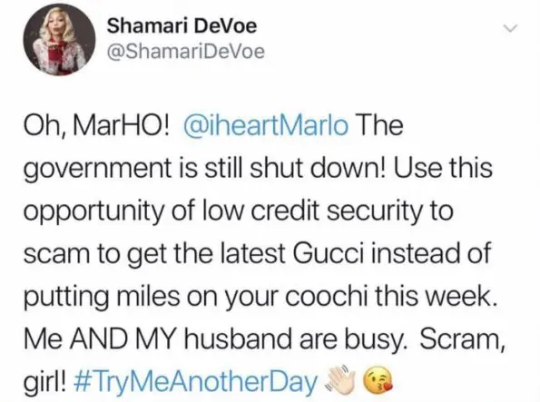 Marlo caught wind of Shamari’s shady WWHL shout-out, and clapped back on Twitter. She said: