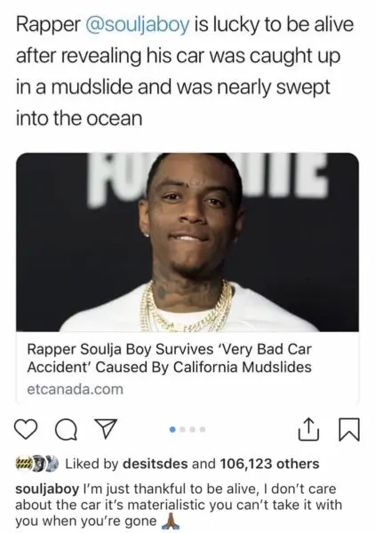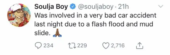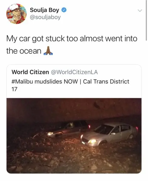Rapper/reality TV star Soulja Boy is appreciating life on social media after a dangerous car accident in California. Powerful rain storms recently shut down the Pacific Coast Highway with flooding, which caused his vehicle to get stuck and nearly swept into the ocean. Soulja Boy retweeted several Twitter links and photos detailing the damages of the Malibu mudslides before alerting his fans that he, too, was involved.