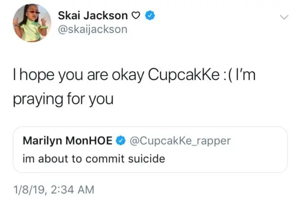 Actresses Skai Jackson quote tweeted the suicidal tweet adding,