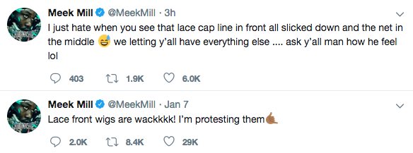 Meek Mill talked about his involvement with lace front wigs on Twitter recently and his causing quite the stir among his followers. The Philadelphia rapper tweeted on Monday (Jan. 7),