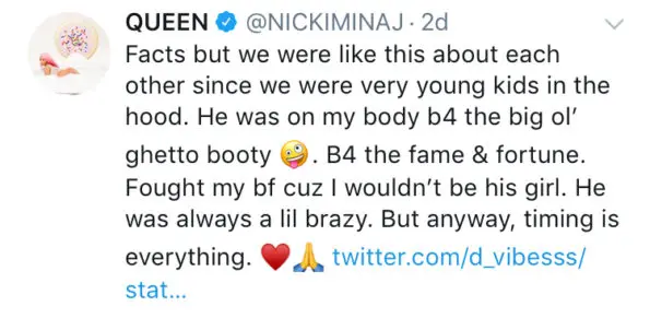 Facts but we were like this about each other since we were very young kids in the hood. He was on my body b4 the big ol’ ghetto booty. B4 the fame & fortune. Fought my bf cuz I wouldn’t be his girl. He was always a lil brazy. But anyway, timing is everything.