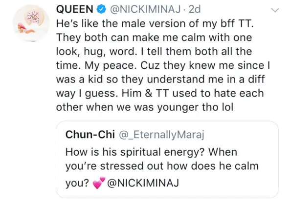 He’s like the male version of my bff TT. They both can make me calm with one look, hug, word. I tell them both all the time. My peace. Cuz they knew me since I was a kid so they understand me in a diff way I guess. Him & TT used to hate each other when we was younger tho lol
