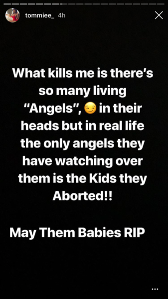 “What kills me is there’s so many living “Angels”, in their heads but in real life the only angels they have watching over them is the Kids they Aborted!! May Them Babies RIP…Watch yourselves it could get Nasty, But I’m so in A Great space! Maoving on!! So should you!…For the lives that was cut out of me I’ll Do 100 years!…”Meaning” they are my Life So Let’s stop Now!!”