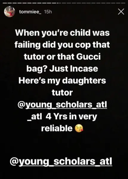 She even showed that she recruited a tutor for her oldest daughter, Samaria. In fact, Tommie mentioned that this tutor was reportedly also tapped for the children of the Mayor of Atlanta, Keisha Lance Bottoms.