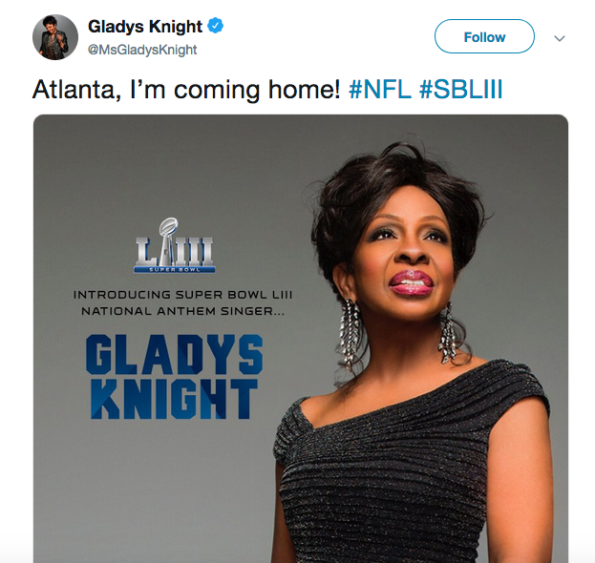 Gladys Knight will be singing the national anthem before kickoff at Super Bowl LIII. Knight, who was born and raised in Atlanta, confirmed she would be filling the spot in a tweet,