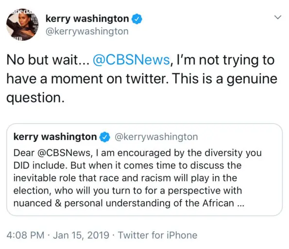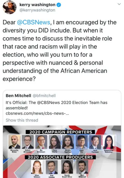 Kerry Washington inquired why CBS News failed to appoint any African-American reporters within their 2020 Campaign Reporting Team on Sunday (Jan. 13). Washington tweeted,