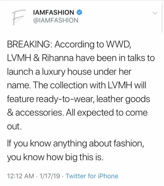 Sources say LVMH (Louis Vuitton Moët Hennessy) has been in secret talks with Rihanna to launch her own fashion house under her name. Both Louis Vuitton and Celine employees have been handpicked to assist Rihanna. This will be a historic launch, considering fashion industry legend Bernard Arnault hasn’t built a brand from the ground up since Christian Lacroix in 1987.