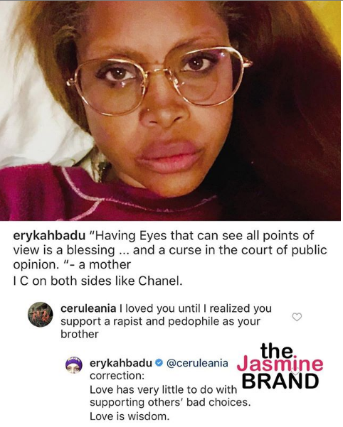 Would you love an alleged predator despite his actions? In a recent Instagram post, legendary singer Erykah Badu captions a photo with a message of having the ability of understanding “all points of view,” over the actions and words of the public opinion. Badu, 47, one of many celebrities that declined the offer to speak with the ‘Surviving R. Kelly,’ 6-part series that has ultimately accomplished to have R.Kelly dropped his label.