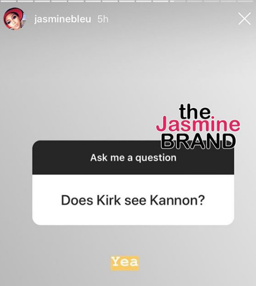 This week, Jasmine gave a quick update on the status of Kirk’s relationship with now 2-year-old baby Kannon. Washington, 29, answered a few questions via Instagram.