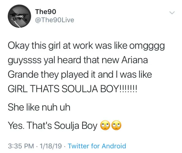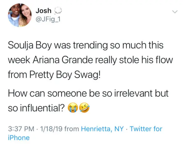 DID ARIANA GRANDE STEAL SOULJA BOY’S FLOW TOO? ?? #7Rings pic.twitter.com/q0q8pRAEg9