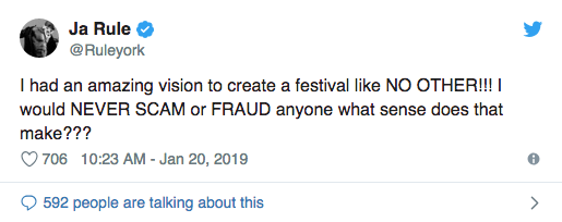 Upon the release of the documentaries Ja Rule took to Twitter to once again clear his name and give his side of the matter, insisting that he was scammed and lied to just as the attendees were.