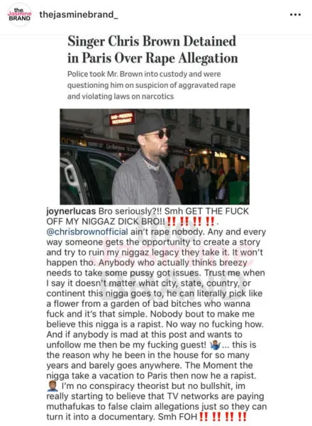 Brown, 29, was last reported to be held in custody in Paris due to accusations he raped an unidentified woman at the Le Mandarin Oriental hotel on the night of January 15-16, 2019. He, and two other unidentified suspects, were being held on rape accusations and possible drug infractions. While fans maintained Brown’s innocence, other celebrities like T.I. and Joyner Lucas weighed in on the damaging headlines, too.