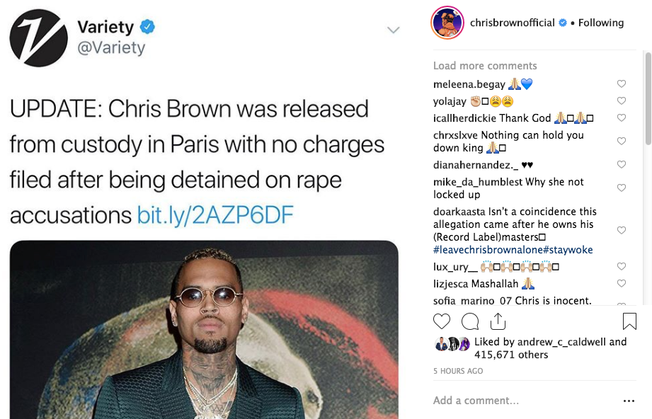 Chris Brown has made an official statement following allegations he raped a 24-year-old unidentified woman while in Paris on Monday. The singer shared a message on Instagram with a text post which read,