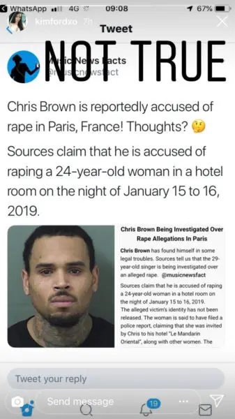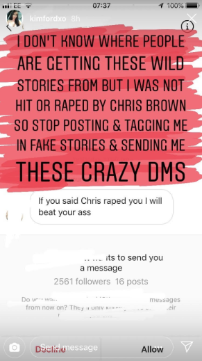 “I DON’T KNOW WHERE PEOPLE ARE GETTING THESE WILD STORIES FROM BUT I WAS NOT HIT OR RAPED BY CHRIS BROWN SO STOP POSTING & TAGGING ME IN FAKE STORIES & SENDING ME THESE CRAZY DMS”