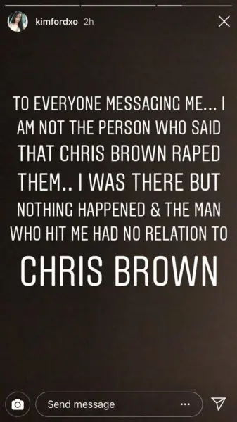 “TO EVERYONE MESSAGING ME… I AM NOT THE PERSON WHO SAID THAT CHRIS BROWN RAPED THEM.. I WAS THERE BUT NOTHING HAPPENED & THE MAN WHO HIT ME HAD NO RELATION TO CHRIS BROWN”