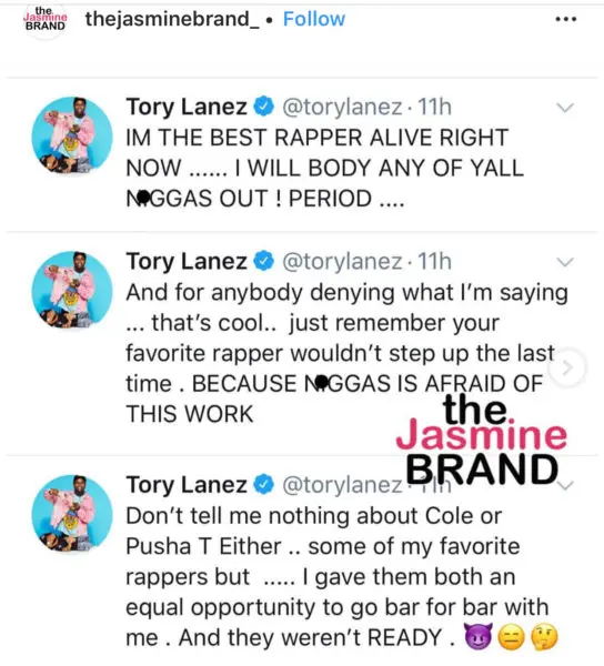 In his later tweets, Lanez shared how he challenged Drake’s 2018 rap rival Pusha T and Hip-Hop’s highly buzzed artist J. Cole.