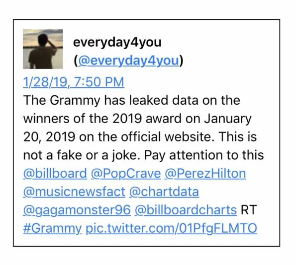 “The Grammy has leaked data on the winners of the 2019 award on January 20, 2019 on the official website. This is not a fake or a joke. Pay attention to this”