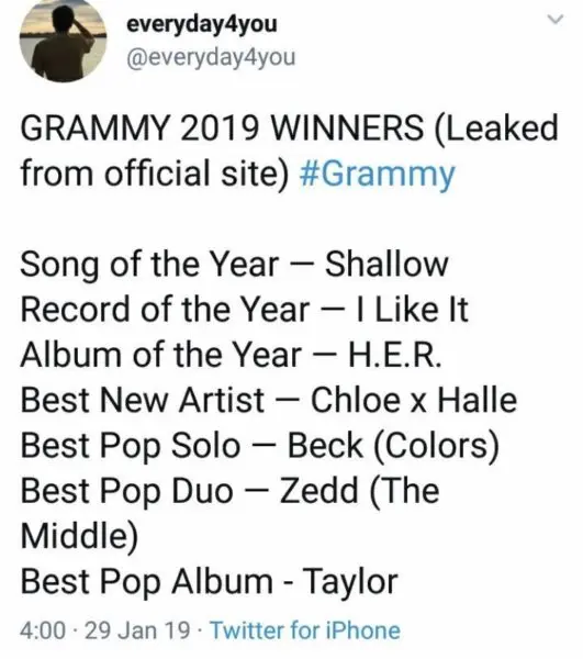 There’s no need to celebrate your faves’ Grammy wins just yet. A list of alleged winners of the Grammy Awards’ most prestigious honors of the night were recently leaked. Twitter user @everyday4you claimed that this information was prematurely leaked to the public on the Recording Academy’s official website, tagging several music and pop culture blogs. The tweet, filled with grammatical errors, read: