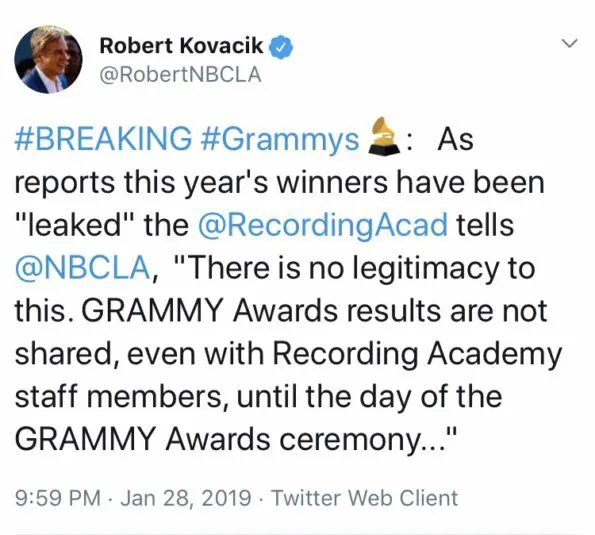 “There is no legitimacy to this. GRAMMY Awards results are not shared, even with Recording Academy staff members, until the day of the GRAMMY Awards ceremony…”