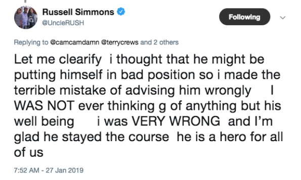 Fast forward to 2019 and Simmons is apologizing via Twitter to Crews for his previous advice and also praising his bravery for speaking out: