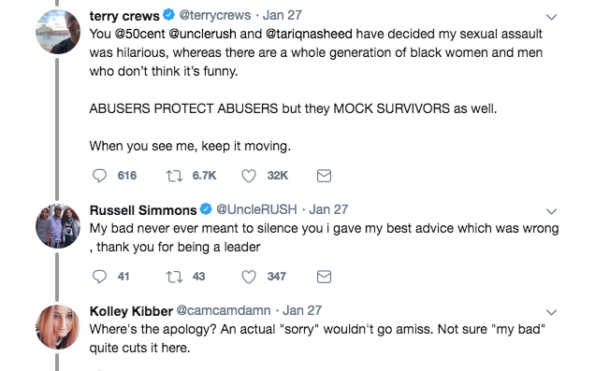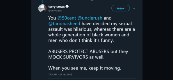 “You @50cent @unclerush and @tariqnasheed have decided my sexual assault was hilarious, whereas there are a whole generation of black women and men who don’t think it’s funny. ABUSERS PROTECT ABUSERS but they MOCK SURVIVORS as well. When you see me, keep it moving.”