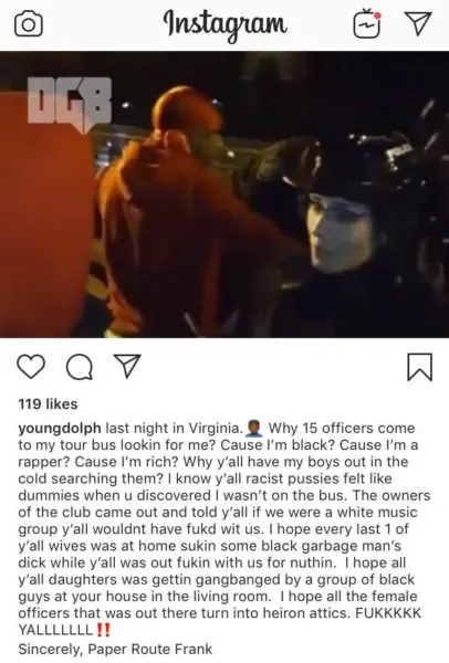 “@youngdolph last night in Virginia. Why 15 officers come to my tour bus lookin for me? Cause I’m black? Cause I’m a rapper? Cause I’m rich? Why y’all have my boys out in the cold searching them? I know y’all racist p*ssies felt like dummies when u discovered I wasn’t on the bus. The owners of the club came out and told y’all if we were a white music group y’all wouldnt have f*kd wit us.”