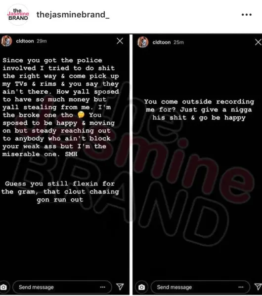 “Since you got the police involved I tried to do sh*t the right way & come pick up my TVs & rims & you say they ain’t there. How y’all sposed to have so much money but y’all stealing from me. I’m the broke one tho[?] You sposed to be happy & moving on but steady reaching out to anybody who block your weak ass but I’m the miserable one. MSH Guess you still flexin for the gram, that clout chasing gon run out