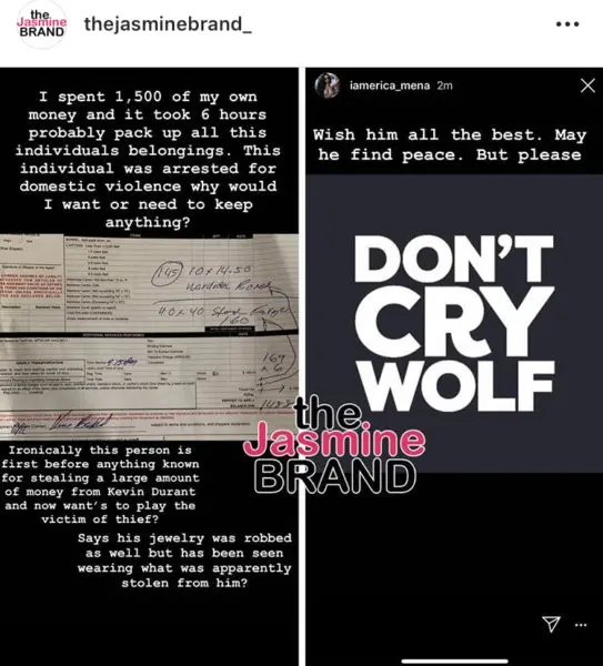 I spent 1,500 of my own money and it took 6 hours probably pack up all this indivduals belongings. This individual was arrested for domestic violence why would I want or need to keep anything? Ironically this person is first – before anything – known for stealing large amount of money from Kevin Durant and now wants to play the victim of [theft]? Says his jewelry was robbed as well, but has been seen wearing what was apparently stolen from him?