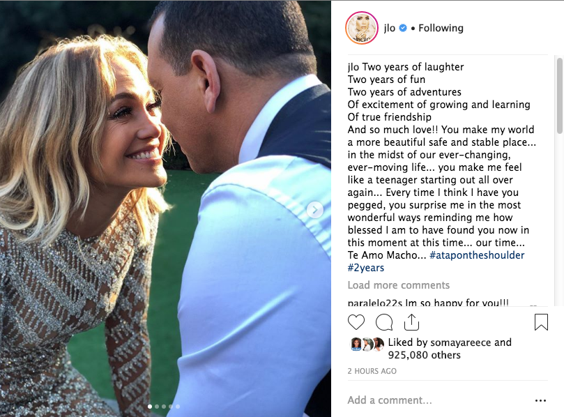 Jennifer Lopez (J.Lo) is celebrating two sweet years with boyfriend Alex Rodriguez (A-Rod). Over the weekend, she reminisced over their relationship, penning a sentimental social media post. She writes,