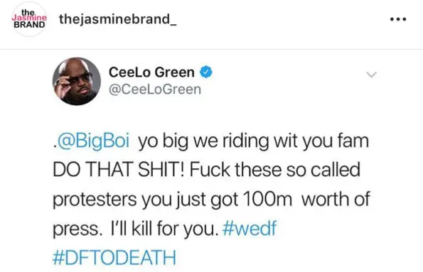 @BigBoi yo big we riding wit you fam DO THAT SH*T! Fu*k these so called protesters you just got 100m worth of press. I’ll kill for you #wedf #DFTODEATH