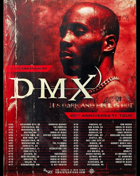 DMX (real name Earl Simmons) is taking his talents on the road. The 48-year-old rapper announced this week that he’s kicking off the 20th anniversary of “It’s Dark And Hell Is Hot” next month. See the tour schedule below.