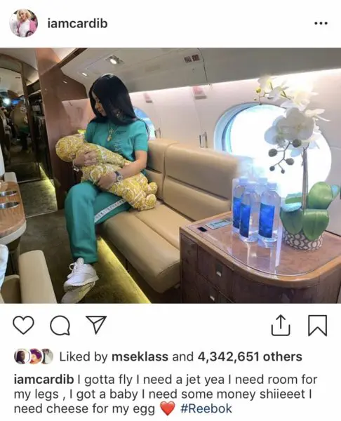 “@iamcardib I gotta fly I need a jet yea I need room for my legs , I got a baby I need some money shiieeet I need cheese for my egg #Reebok”