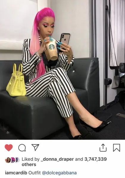 Cardi also posted a photo of herself casually scrolling her timeline in a striped Dolce and Gabbanna suit last month. The true sign of wealth was her Venti-sized Starbucks frappucino!