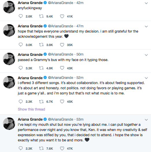Ariana Grande has provided a statement regarding her canceled performance for the Grammys, scheduled to air Sunday, Feb. 10. The threaded Twitter response comes after Grammy producer Ken Ehrlich came forward Thursday with a statement as to why the performance was axed: